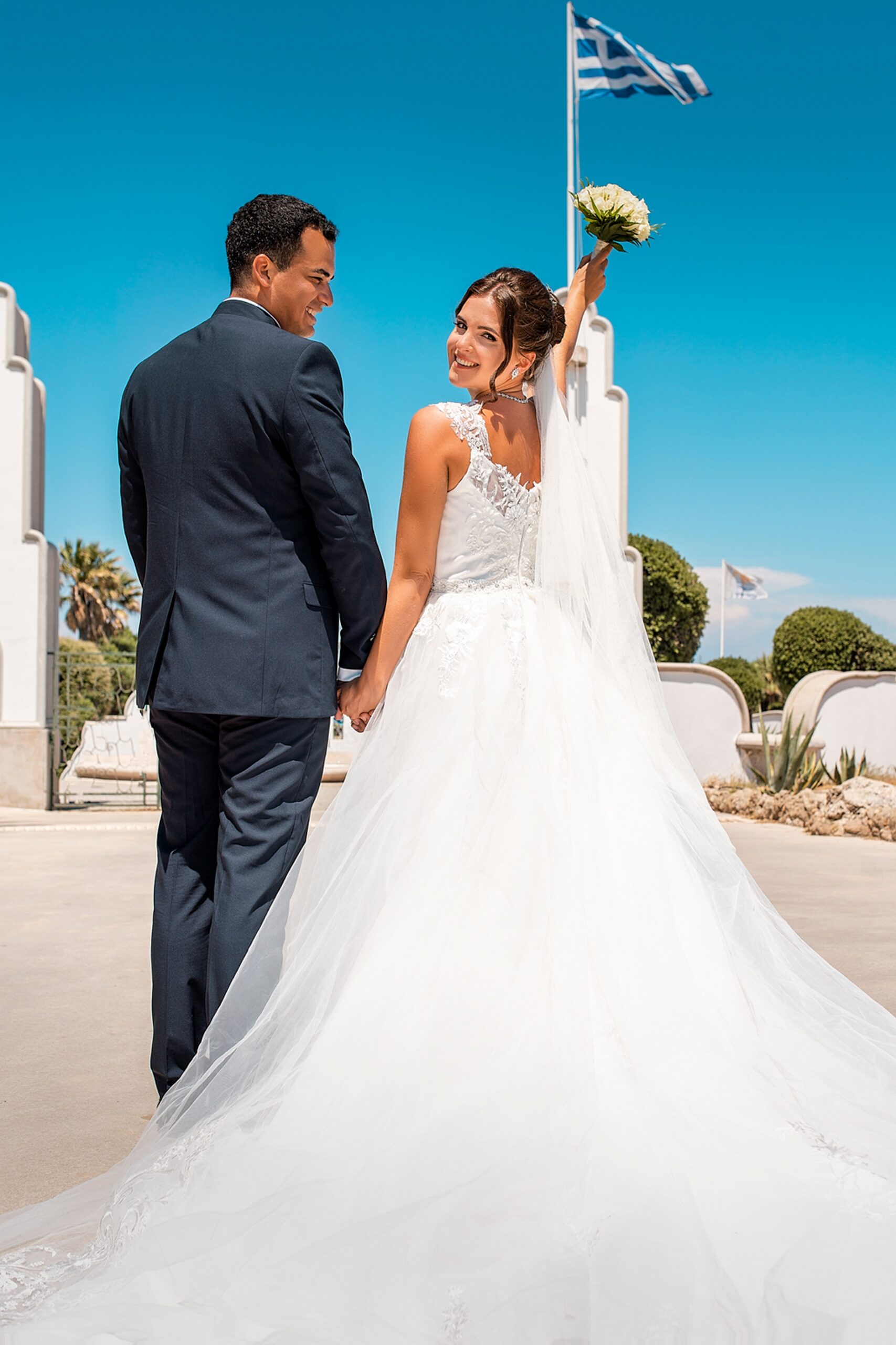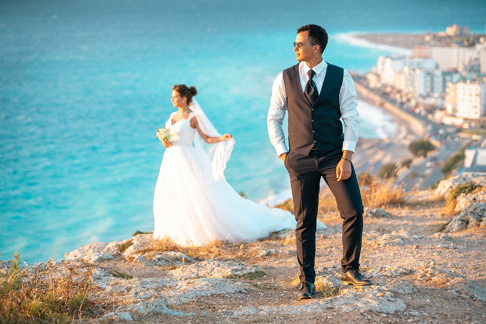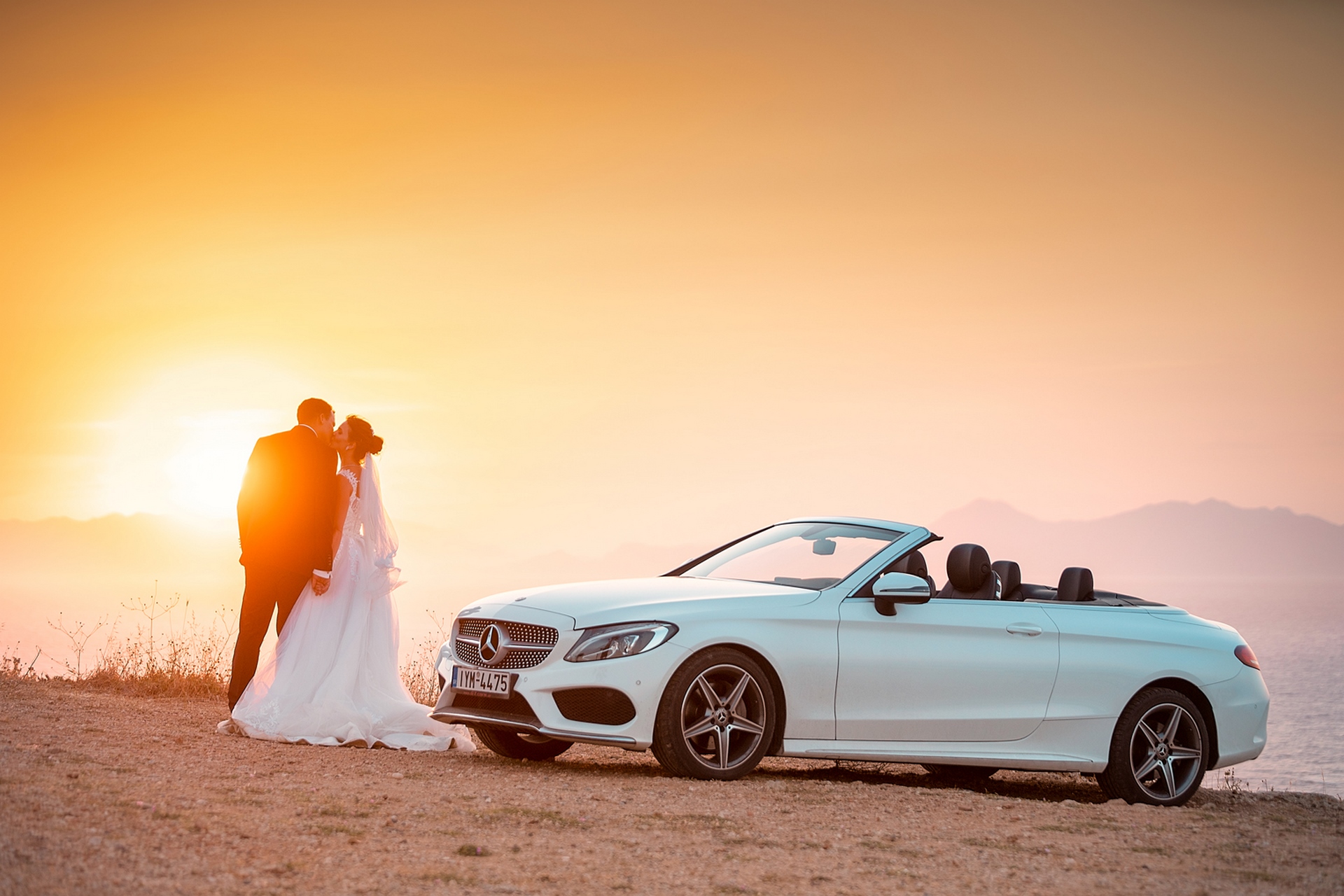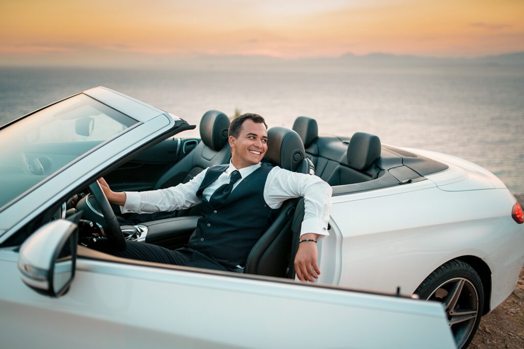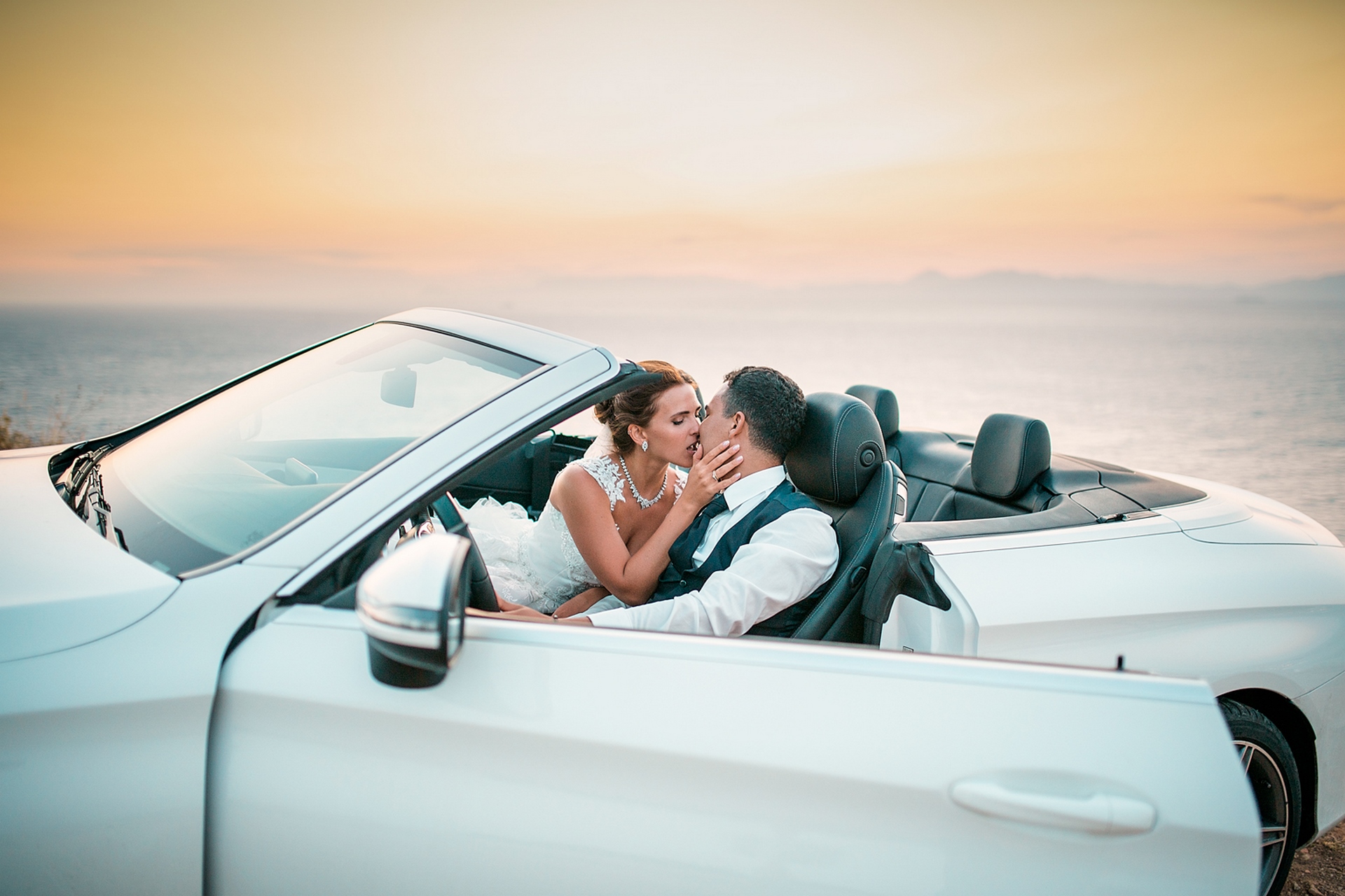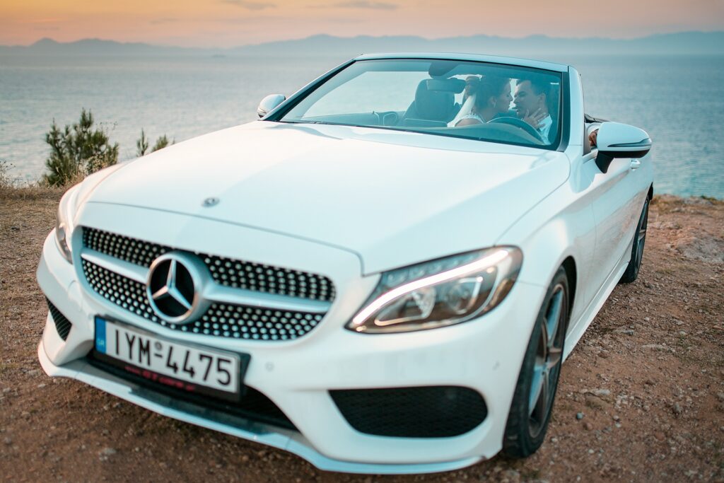 Is becoming popular among couples to arrange a wedding for “two”, without guests and a lot of noise, as our couple in love did. after the official part, we went to continue our photo and video shooting in the beautiful places of Rhodes island. A great addition to the shooting was a white convertible Mercedes, that our newlyweds ordered for their special day.